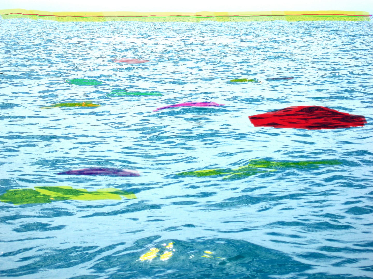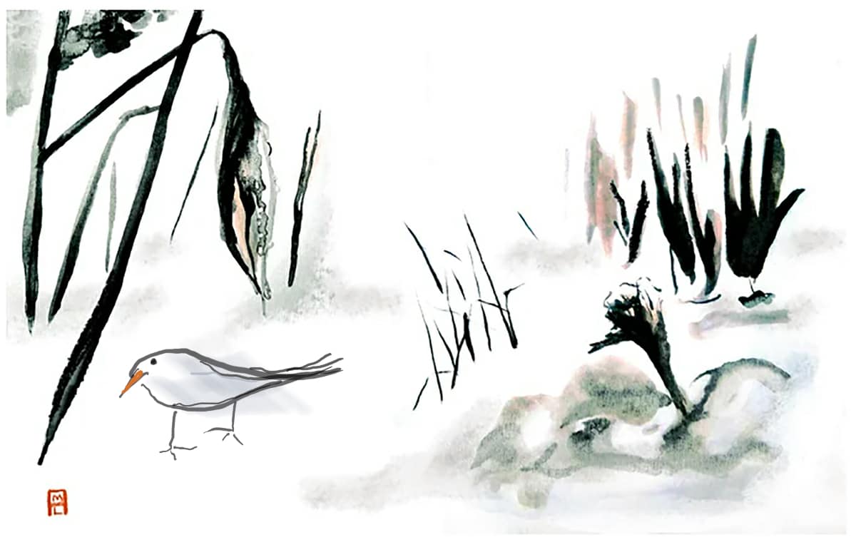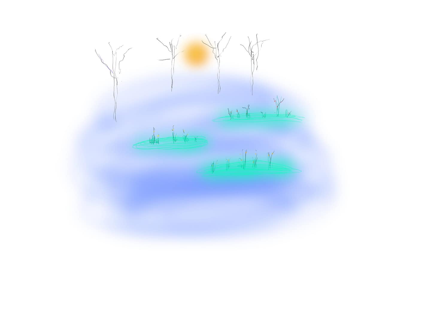 ”En stilla sjö i morgondis, en flytande ö rör sig sakta…